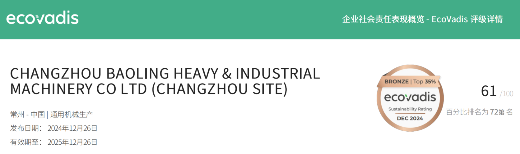 2024年12月26日,寶菱重工在EcoVadis企業(yè)社會責任評估中得分61分,并榮獲“銅牌”,在EcoVadis所有在評公司中躋身于前 35%(已超過 65% 以上的公司)。當前,“環(huán)境、社會責任和公司治理”(簡稱:ESG)水平已成為衡量企業(yè)長期價值和可持續(xù)發(fā)展能力的關鍵因素,其核心在于“友好環(huán)境、尊重員工、合規(guī)經營、可持續(xù)發(fā)展”。公司將可持續(xù)發(fā)展理念融入企業(yè)戰(zhàn)略與日程經營活動中,推動導入ESG